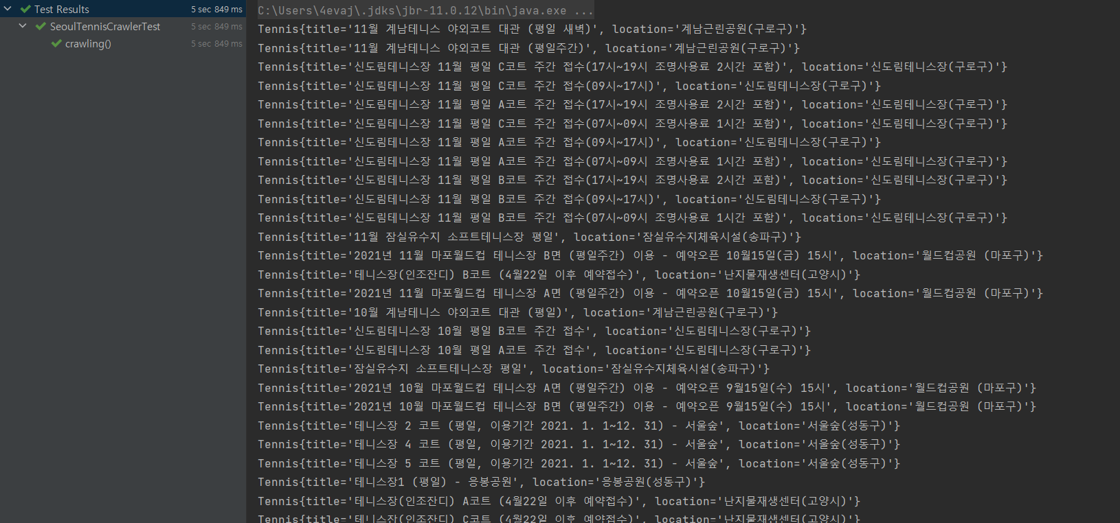 이제 각각 titleElements와 locationElements를 가져왔고 반복문을 통해 text 값을 추출해 Tennis 객체를 만들고 List에 담도록 하였습니다.
